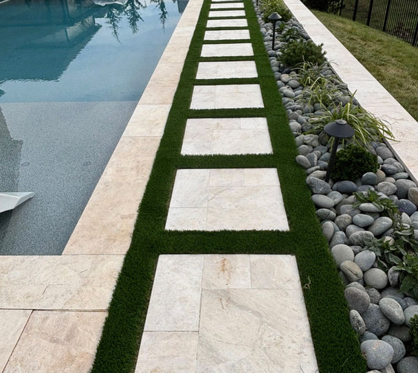 Turf installations that pair seamlessly with pavers and stepping stones, creating a polished, low-maintenance look while improving drainage and softening hardscape transitions.